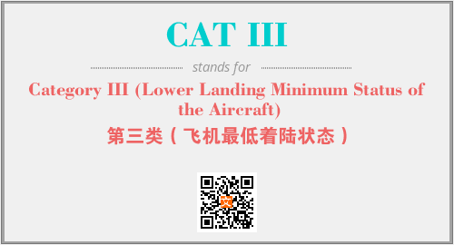 英文缩略词“CAT III”经常作为“Category III (Lower Landing Minimum Status of the Aircraft)”的英文缩写来使用,中文表示:“第三类(飞机最低着陆状态)”。本文将详细介绍英文缩写词CAT III所代表英文单词,其对应的中文拼音、详细解释以及在英语中的流行度。此外,还有关于缩略词CAT III的分类、应用领域及相关应用示例等。