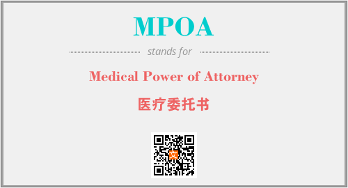 上述内容是“Medical Power of Attorney”作为“MPOA”的缩写,解释为“医疗委托书”时的信息,以及英文缩略词MPOA所代表的英文单词,其对应的中文拼音、详细解释以及在英文中的流行度和相关分类、应用领域及应用示例等。
