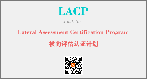 上述内容是“Lateral Assessment Certification Program”作为“LACP”的缩写,解释为“横向评估认证计划”时的信息,以及英文缩略词LACP所代表的英文单词,其对应的中文拼音、详细解释以及在英文中的流行度和相关分类、应用领域及应用示例等。