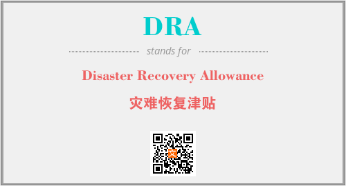 上述内容是“Disaster Recovery Allowance”作为“DRA”的缩写,解释为“灾难恢复津贴”时的信息,以及英文缩略词DRA所代表的英文单词,其对应的中文拼音、详细解释以及在英文中的流行度和相关分类、应用领域及应用示例等。