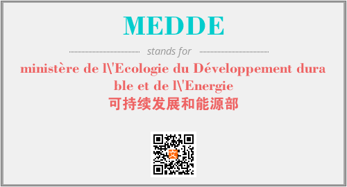 上述内容是“ministère de l\'Ecologie du Développement durable et de l\'Energie”作为“MEDDE”的缩写,解释为“可持续发展和能源部”时的信息,以及英文缩略词MEDDE所代表的英文单词,其对应的中文拼音、详细解释以及在英文中的流行度和相关分类、应用领域及应用示例等。
