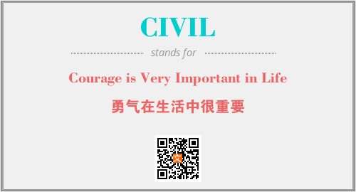 英文缩略词“CIVIL”经常作为“Courage is Very Important in Life”的英文缩写来使用,中文表示:“勇气在生活中很重要”。本文将详细介绍英文缩写词CIVIL所代表英文单词,其对应的中文拼音、详细解释以及在英语中的流行度。此外,还有关于缩略词CIVIL的分类、应用领域及相关应用示例等。