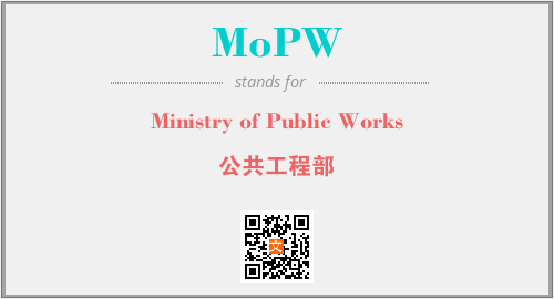 上述内容是“Ministry of Public Works”作为“MoPW”的缩写,解释为“公共工程部”时的信息,以及英文缩略词MoPW所代表的英文单词,其对应的中文拼音、详细解释以及在英文中的流行度和相关分类、应用领域及应用示例等。