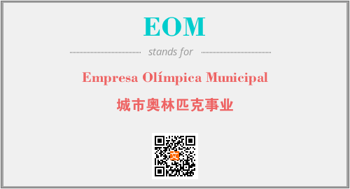 上述内容是“Empresa Olímpica Municipal”作为“EOM”的缩写,解释为“城市奥林匹克事业”时的信息,以及英文缩略词EOM所代表的英文单词,其对应的中文拼音、详细解释以及在英文中的流行度和相关分类、应用领域及应用示例等。