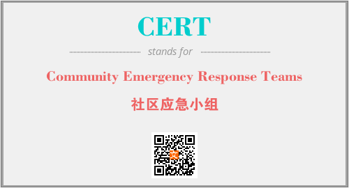 上述内容是“Community Emergency Response Teams”作为“CERT”的缩写,解释为“社区应急小组”时的信息,以及英文缩略词CERT所代表的英文单词,其对应的中文拼音、详细解释以及在英文中的流行度和相关分类、应用领域及应用示例等。