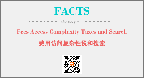 上述内容是“Fees Access Complexity Taxes and Search”作为“FACTS”的缩写,解释为“费用访问复杂性税和搜索”时的信息,以及英文缩略词FACTS所代表的英文单词,其对应的中文拼音、详细解释以及在英文中的流行度和相关分类、应用领域及应用示例等。