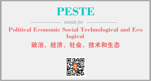 上述内容是“Political Economic Social Technological and Ecological”作为“PESTE”的缩写,解释为“政治、经济、社会、技术和生态”时的信息,以及英文缩略词PESTE所代表的英文单词,其对应的中文拼音、详细解释以及在英文中的流行度和相关分类、应用领域及应用示例等。