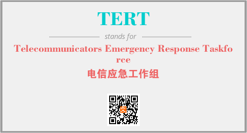 上述内容是“Telecommunicators Emergency Response Taskforce”作为“TERT”的缩写,解释为“电信应急工作组”时的信息,以及英文缩略词TERT所代表的英文单词,其对应的中文拼音、详细解释以及在英文中的流行度和相关分类、应用领域及应用示例等。
