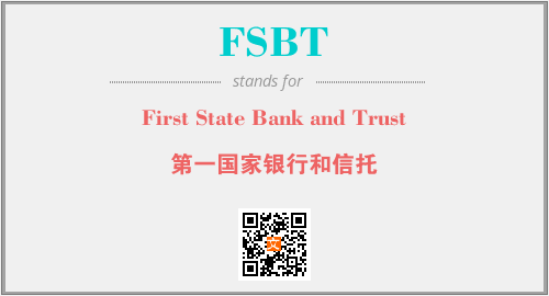 上述内容是“First State Bank and Trust”作为“FSBT”的缩写,解释为“第一国家银行和信托”时的信息,以及英文缩略词FSBT所代表的英文单词,其对应的中文拼音、详细解释以及在英文中的流行度和相关分类、应用领域及应用示例等。