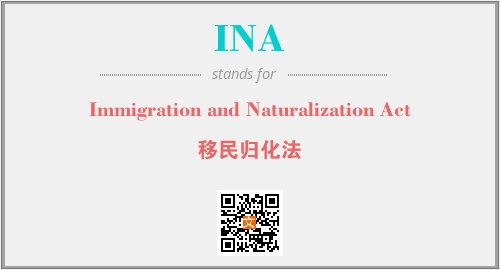 英文缩略词“INA”经常作为“Immigration and Naturalization Act”的英文缩写来使用,中文表示:“移民归化法”。本文将详细介绍英文缩写词INA所代表英文单词,其对应的中文拼音、详细解释以及在英语中的流行度。此外,还有关于缩略词INA的分类、应用领域及相关应用示例等。