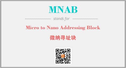 上述内容是“Micro to Nano Addressing Block”作为“MNAB”的缩写,解释为“微纳寻址块”时的信息,以及英文缩略词MNAB所代表的英文单词,其对应的中文拼音、详细解释以及在英文中的流行度和相关分类、应用领域及应用示例等。