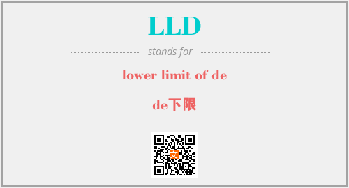 英文缩略词“LLD”经常作为“lower limit of de”的英文缩写来使用,中文表示:“de下限”。本文将详细介绍英文缩写词LLD所代表英文单词,其对应的中文拼音、详细解释以及在英语中的流行度。此外,还有关于缩略词LLD的分类、应用领域及相关应用示例等。