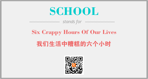 以上为Six Crappy Hours Of Our Lives英文缩略词SCHOOL的中文解释,以及该英文缩写在英语的流行度、分类和应用领域方面的信息。
