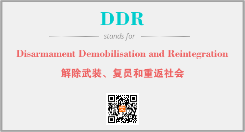 上述内容是“Disarmament Demobilisation and Reintegration”作为“DDR”的缩写,解释为“解除武装、复员和重返社会”时的信息,以及英文缩略词DDR所代表的英文单词,其对应的中文拼音、详细解释以及在英文中的流行度和相关分类、应用领域及应用示例等。