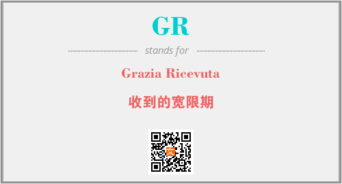 上述内容是“Grazia Ricevuta”作为“GR”的缩写,解释为“收到的宽限期”时的信息,以及英文缩略词GR所代表的英文单词,其对应的中文拼音、详细解释以及在英文中的流行度和相关分类、应用领域及应用示例等。