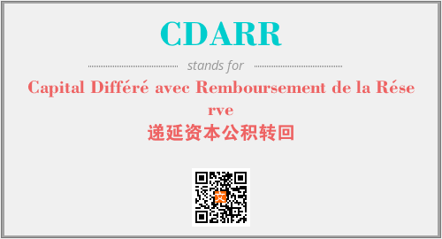 上述内容是“Capital Différé avec Remboursement de la Réserve”作为“CDARR”的缩写,解释为“递延资本公积转回”时的信息,以及英文缩略词CDARR所代表的英文单词,其对应的中文拼音、详细解释以及在英文中的流行度和相关分类、应用领域及应用示例等。