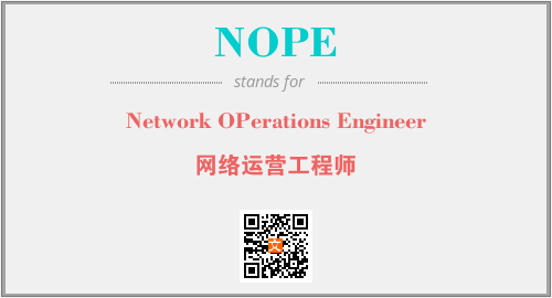 上述内容是“Network OPerations Engineer”作为“NOPE”的缩写,解释为“网络运营工程师”时的信息,以及英文缩略词NOPE所代表的英文单词,其对应的中文拼音、详细解释以及在英文中的流行度和相关分类、应用领域及应用示例等。