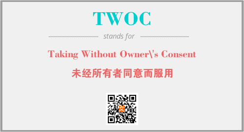 上述内容是“Taking Without Owner\'s Consent”作为“TWOC”的缩写,解释为“未经所有者同意而服用”时的信息,以及英文缩略词TWOC所代表的英文单词,其对应的中文拼音、详细解释以及在英文中的流行度和相关分类、应用领域及应用示例等。