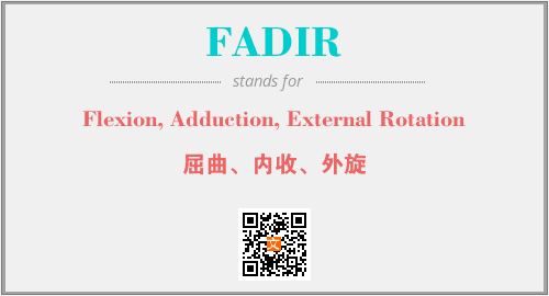 英文缩略词“FADIR”经常作为“Flexion, Adduction, External Rotation”的英文缩写来使用,中文表示:“屈曲、内收、外旋”。本文将详细介绍英文缩写词FADIR所代表英文单词,其对应的中文拼音、详细解释以及在英语中的流行度。此外,还有关于缩略词FADIR的分类、应用领域及相关应用示例等。