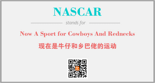 上述内容是“Now A Sport for Cowboys And Rednecks”作为“NASCAR”的缩写,解释为“现在是牛仔和乡巴佬的运动”时的信息,以及英文缩略词NASCAR所代表的英文单词,其对应的中文拼音、详细解释以及在英文中的流行度和相关分类、应用领域及应用示例等。