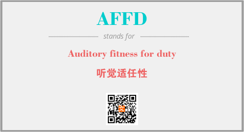 上述内容是“Auditory fitness for duty”作为“AFFD”的缩写,解释为“听觉适任性”时的信息,以及英文缩略词AFFD所代表的英文单词,其对应的中文拼音、详细解释以及在英文中的流行度和相关分类、应用领域及应用示例等。