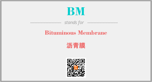 上述内容是“Bituminous Membrane”作为“BM”的缩写,解释为“沥青膜”时的信息,以及英文缩略词BM所代表的英文单词,其对应的中文拼音、详细解释以及在英文中的流行度和相关分类、应用领域及应用示例等。