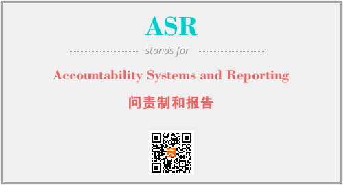 上述内容是“Accountability Systems and Reporting”作为“ASR”的缩写,解释为“问责制和报告”时的信息,以及英文缩略词ASR所代表的英文单词,其对应的中文拼音、详细解释以及在英文中的流行度和相关分类、应用领域及应用示例等。