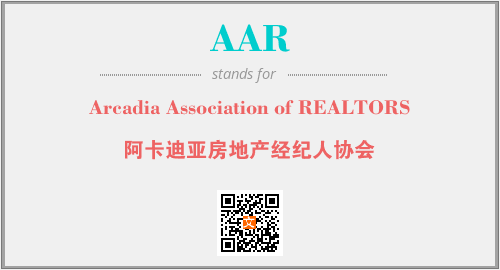 上述内容是“Arcadia Association of REALTORS”作为“AAR”的缩写,解释为“阿卡迪亚房地产经纪人协会”时的信息,以及英文缩略词AAR所代表的英文单词,其对应的中文拼音、详细解释以及在英文中的流行度和相关分类、应用领域及应用示例等。