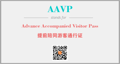 上述内容是“Advance Accompanied Visitor Pass”作为“AAVP”的缩写,解释为“提前陪同游客通行证”时的信息,以及英文缩略词AAVP所代表的英文单词,其对应的中文拼音、详细解释以及在英文中的流行度和相关分类、应用领域及应用示例等。