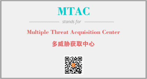 英文缩略词“MTAC”经常作为“Multiple Threat Acquisition Center”的英文缩写来使用,中文表示:“多威胁获取中心”。本文将详细介绍英文缩写词MTAC所代表英文单词,其对应的中文拼音、详细解释以及在英语中的流行度。此外,还有关于缩略词MTAC的分类、应用领域及相关应用示例等。