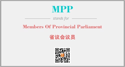 上述内容是“Members Of Provincial Parliament”作为“MPP”的缩写,解释为“省议会议员”时的信息,以及英文缩略词MPP所代表的英文单词,其对应的中文拼音、详细解释以及在英文中的流行度和相关分类、应用领域及应用示例等。