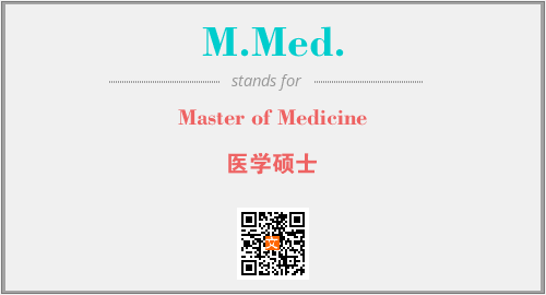 英文缩略词“M.Med.”经常作为“Master of Medicine”的英文缩写来使用,中文表示:“医学硕士”。本文将详细介绍英文缩写词M.Med.所代表英文单词,其对应的中文拼音、详细解释以及在英语中的流行度。此外,还有关于缩略词M.Med.的分类、应用领域及相关应用示例等。