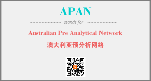 上述内容是“Australian Pre Analytical Network”作为“APAN”的缩写,解释为“澳大利亚预分析网络”时的信息,以及英文缩略词APAN所代表的英文单词,其对应的中文拼音、详细解释以及在英文中的流行度和相关分类、应用领域及应用示例等。