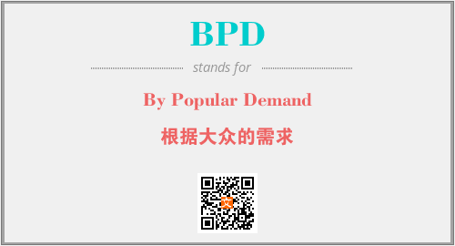 上述内容是“By Popular Demand”作为“BPD”的缩写,解释为“根据大众的需求”时的信息,以及英文缩略词BPD所代表的英文单词,其对应的中文拼音、详细解释以及在英文中的流行度和相关分类、应用领域及应用示例等。
