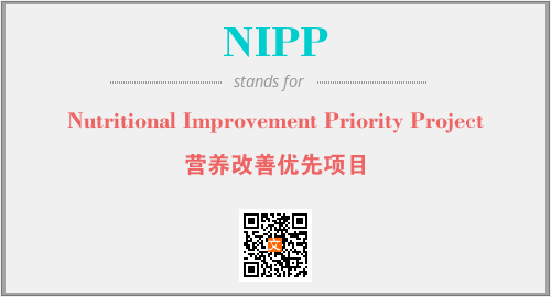 上述内容是“Nutritional Improvement Priority Project”作为“NIPP”的缩写,解释为“营养改善优先项目”时的信息,以及英文缩略词NIPP所代表的英文单词,其对应的中文拼音、详细解释以及在英文中的流行度和相关分类、应用领域及应用示例等。