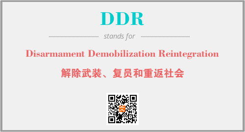 上述内容是“Disarmament Demobilization Reintegration”作为“DDR”的缩写,解释为“解除武装、复员和重返社会”时的信息,以及英文缩略词DDR所代表的英文单词,其对应的中文拼音、详细解释以及在英文中的流行度和相关分类、应用领域及应用示例等。