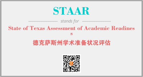 英文缩略词“STAAR”经常作为“State of Texas Assessment of Academic Readiness”的英文缩写来使用,中文表示:“德克萨斯州学术准备状况评估”。本文将详细介绍英文缩写词STAAR所代表英文单词,其对应的中文拼音、详细解释以及在英语中的流行度。此外,还有关于缩略词STAAR的分类、应用领域及相关应用示例等。