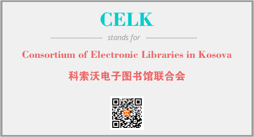 上述内容是“Consortium of Electronic Libraries in Kosova”作为“CELK”的缩写,解释为“科索沃电子图书馆联合会”时的信息,以及英文缩略词CELK所代表的英文单词,其对应的中文拼音、详细解释以及在英文中的流行度和相关分类、应用领域及应用示例等。