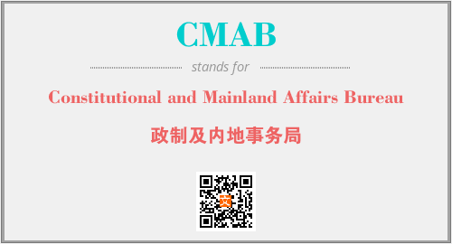 上述内容是“Constitutional and Mainland Affairs Bureau”作为“CMAB”的缩写,解释为“政制及内地事务局”时的信息,以及英文缩略词CMAB所代表的英文单词,其对应的中文拼音、详细解释以及在英文中的流行度和相关分类、应用领域及应用示例等。