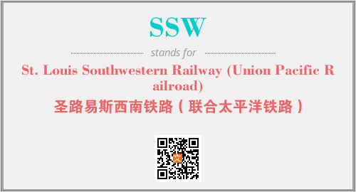 上述内容是“St. Louis Southwestern Railway (Union Pacific Railroad)”作为“SSW”的缩写,解释为“圣路易斯西南铁路(联合太平洋铁路)”时的信息,以及英文缩略词SSW所代表的英文单词,其对应的中文拼音、详细解释以及在英文中的流行度和相关分类、应用领域及应用示例等。
