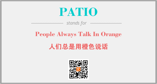 上述内容是“People Always Talk In Orange”作为“PATIO”的缩写,解释为“人们总是用橙色说话”时的信息,以及英文缩略词PATIO所代表的英文单词,其对应的中文拼音、详细解释以及在英文中的流行度和相关分类、应用领域及应用示例等。