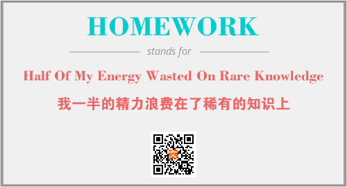 以上为Half Of My Energy Wasted On Rare Knowledge英文缩略词HOMEWORK的中文解释,以及该英文缩写在英语的流行度、分类和应用领域方面的信息。