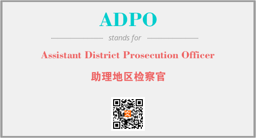 上述内容是“Assistant District Prosecution Officer”作为“ADPO”的缩写,解释为“助理地区检察官”时的信息,以及英文缩略词ADPO所代表的英文单词,其对应的中文拼音、详细解释以及在英文中的流行度和相关分类、应用领域及应用示例等。