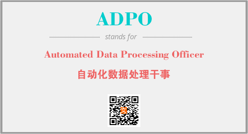 英文缩略词“ADPO”经常作为“Automated Data Processing Officer”的英文缩写来使用,中文表示:“自动化数据处理干事”。本文将详细介绍英文缩写词ADPO所代表英文单词,其对应的中文拼音、详细解释以及在英语中的流行度。此外,还有关于缩略词ADPO的分类、应用领域及相关应用示例等。