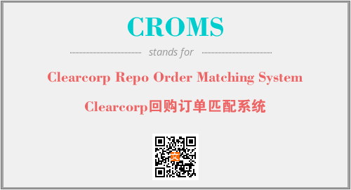 上述内容是“Clearcorp Repo Order Matching System”作为“CROMS”的缩写,解释为“Clearcorp回购订单匹配系统”时的信息,以及英文缩略词CROMS所代表的英文单词,其对应的中文拼音、详细解释以及在英文中的流行度和相关分类、应用领域及应用示例等。
