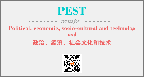 上述内容是“Political, economic, socio-cultural and technological”作为“PEST”的缩写,解释为“政治、经济、社会文化和技术”时的信息,以及英文缩略词PEST所代表的英文单词,其对应的中文拼音、详细解释以及在英文中的流行度和相关分类、应用领域及应用示例等。
