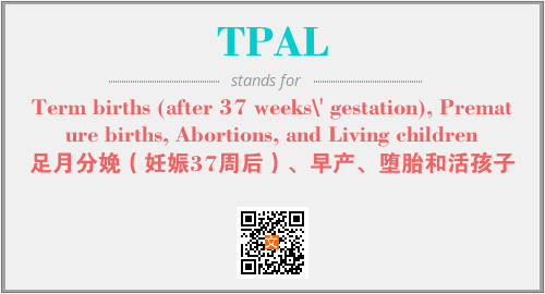 上述内容是“Term births (after 37 weeks\' gestation), Premature births, Abortions, and Living children”作为“TPAL”的缩写,解释为“足月分娩(妊娠37周后)、早产、堕胎和活孩子”时的信息,以及英文缩略词TPAL所代表的英文单词,其对应的中文拼音、详细解释以及在英文中的流行度和相关分类、应用领域及应用示例等。