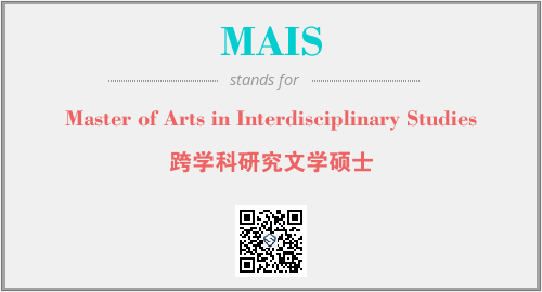 上述内容是“Master of Arts in Interdisciplinary Studies”作为“MAIS”的缩写,解释为“跨学科研究文学硕士”时的信息,以及英文缩略词MAIS所代表的英文单词,其对应的中文拼音、详细解释以及在英文中的流行度和相关分类、应用领域及应用示例等。