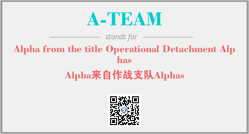 上述内容是“Alpha from the title Operational Detachment Alphas”作为“A-TEAM”的缩写,解释为“Alpha来自作战支队Alphas”时的信息,以及英文缩略词A-TEAM所代表的英文单词,其对应的中文拼音、详细解释以及在英文中的流行度和相关分类、应用领域及应用示例等。