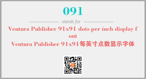 上述内容是“Ventura Publisher 91x91 dots per inch display font”作为“091”的缩写,解释为“Ventura Publisher 91x91每英寸点数显示字体”时的信息,以及英文缩略词091所代表的英文单词,其对应的中文拼音、详细解释以及在英文中的流行度和相关分类、应用领域及应用示例等。